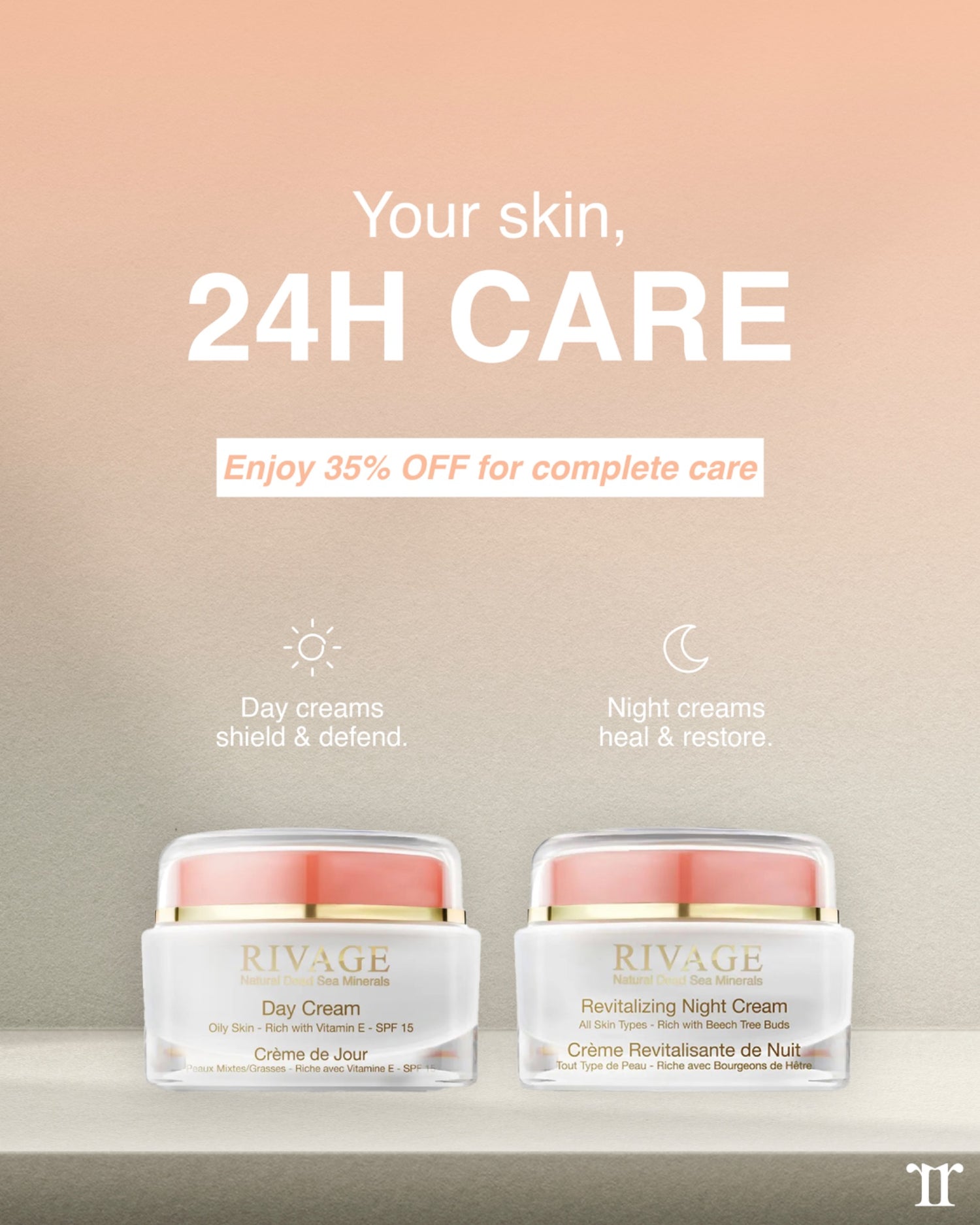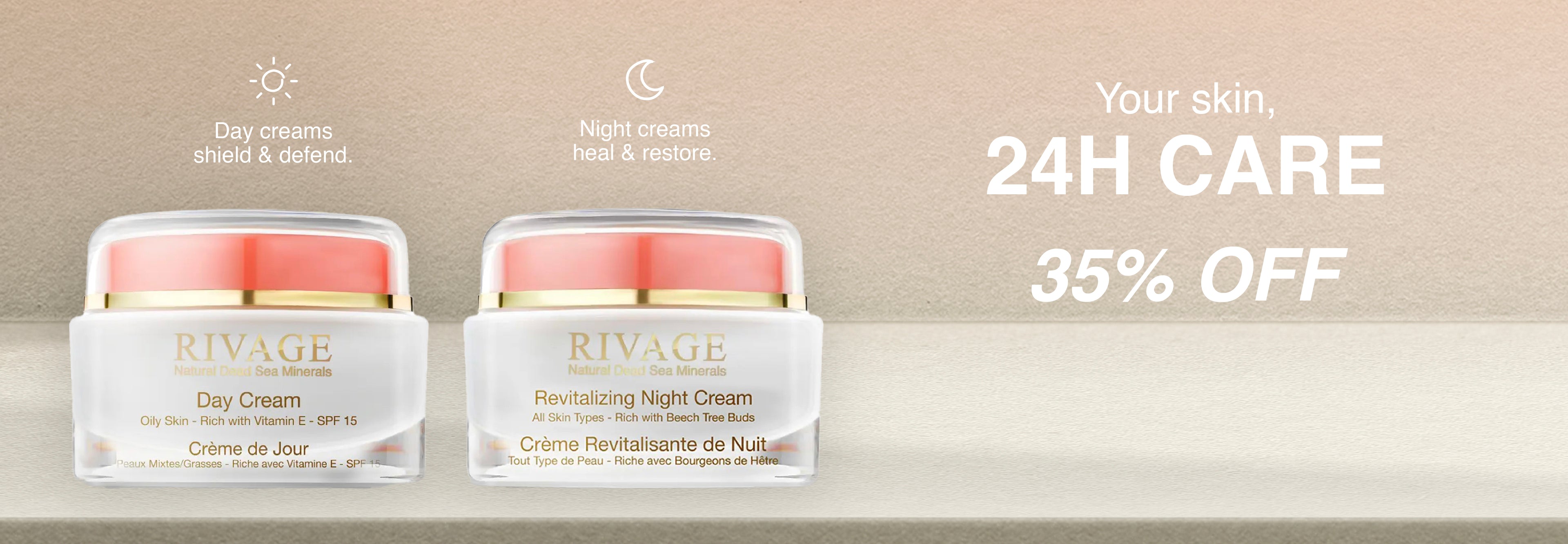 Give your skin complete 24-hour care with Rivage’s Day and Night Creams.